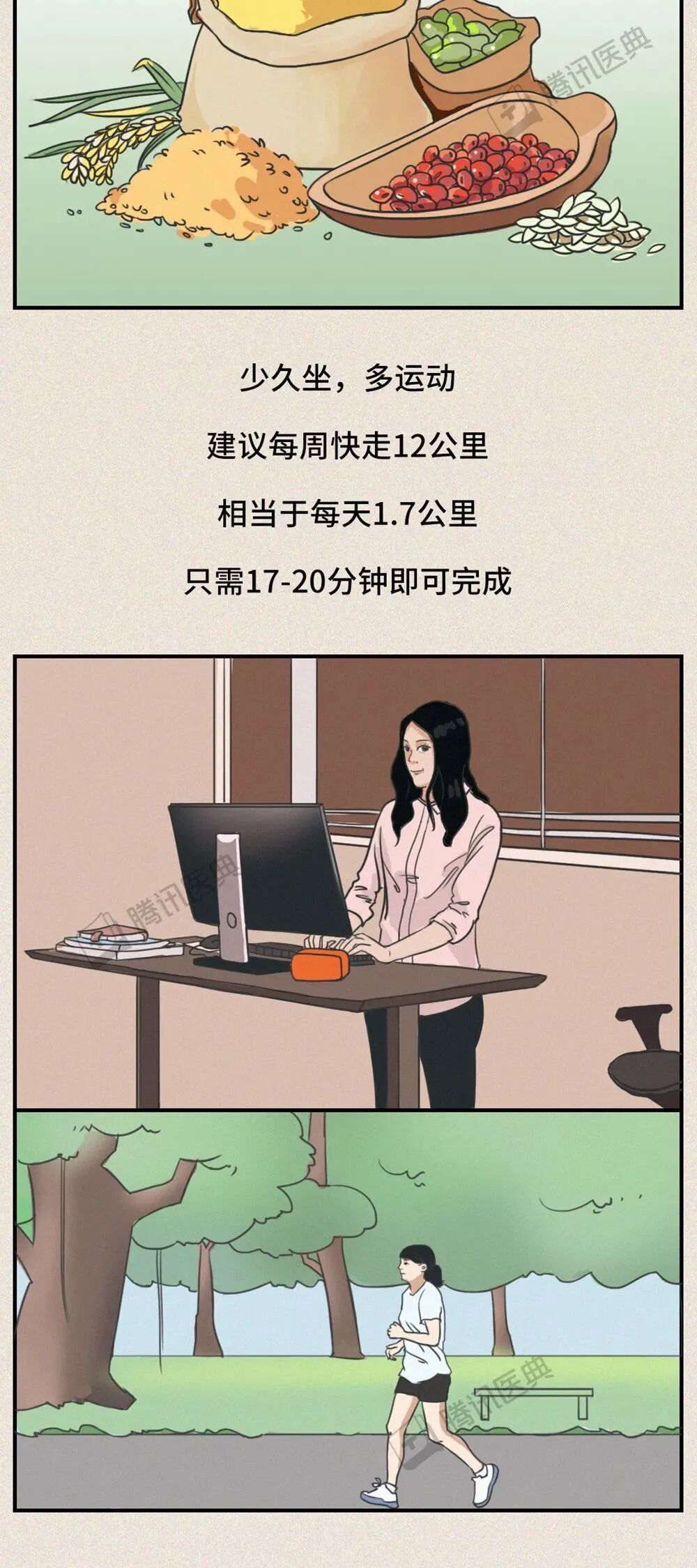 ●超重或肥胖的人、肚子上肉多的人,一定要少吃甜食和不健康的高脂食物,多吃蔬菜、多运动,争取让体重减轻5%~10%,可以降低糖尿病风险[7]。