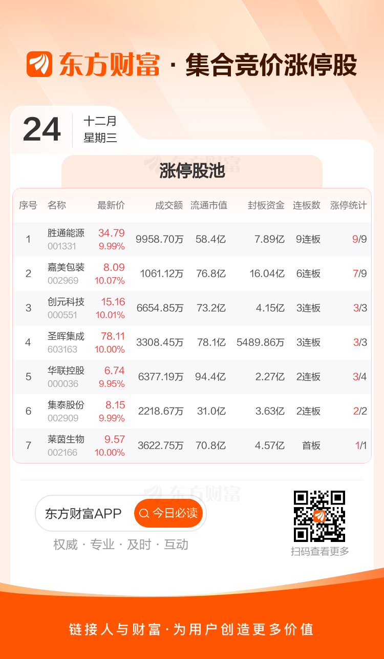 个股方面,7股竞价涨停,其中胜通能源9连板、嘉美包装6连板、创元科技3连板、圣晖集成3连板、华联控股2连板。